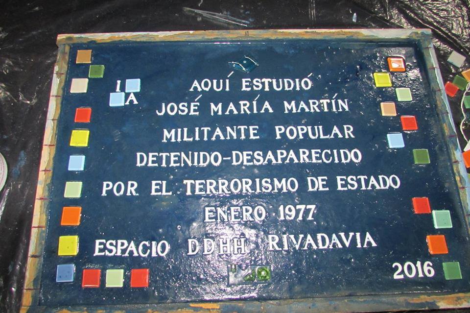 El Espacio de Derechos Humanos de Rivadavia comenzó con sus eventos de conmemoración  por el 40° aniversario del último Golpe de Estado en Argentina. El jueves se llevó adelante la jornada de construcción de la baldosa por la memoria de José María Martín, estudiante del Instituto América, desaparecido durante la dictadura militar mientras cursaba en la ciudad de La Plata.