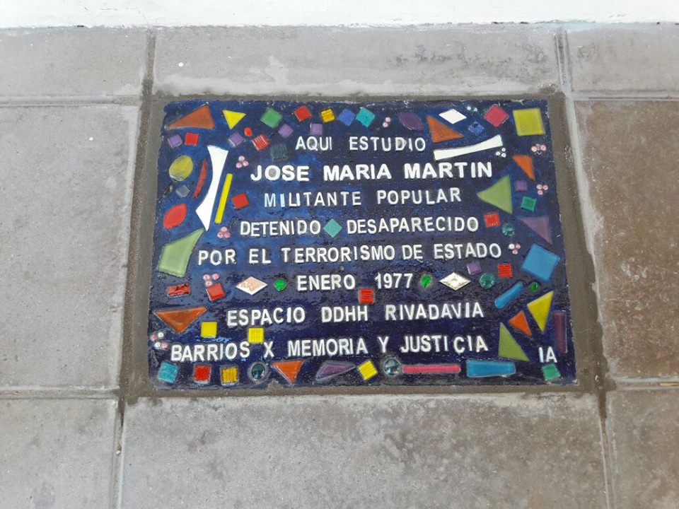 Fue estudiante del Instituto América y desaparecido. El espacio por los derechos humanos local ya había puesto allí una baldosa conmemorativa que fue destruida por autores desconocidos. Ahora, y en el marco por el Día de la Memoria, la Verdad y la Justicia colocaron una nueva.