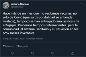 El alcalde hizo el reclamo por medio de sus redes sociales. Allí dejó ver su preocupación por la falta de vacunas contra el Covid -19. También Reynoso se manifestó por las vacunas para la gripe que no llegan a Rivadavia: «Tampoco se han entregado aún las dosis contra la Gripe. Perdemos tiempos determinantes para la comunidad, el sistema sanitario y su situación en los próximos meses invernales».