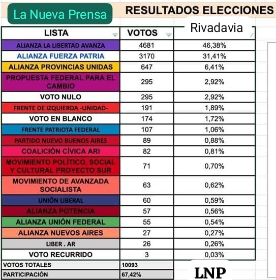 El distrito se tiñó de violeta. El escrutinio local fue para el partido del presidente Milei. Segundo quedó Fuerza Patria y muy lejos en tercer lugar Provincias Unidas, que llevaba al ex intendente Sergio Buil como candidato en el lugar 11 de la lista.