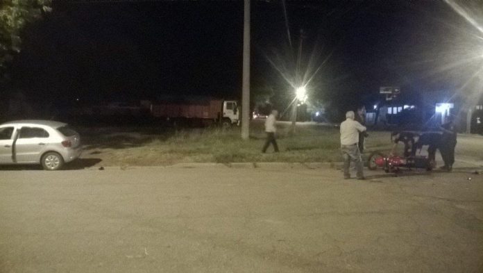 Una moto conducida por Emanuel Rodríguez de 26 años, quien más tarde escribió en el Muro de Facebook de RtpeMultimedios «soy el chico que tuvo el accidente, quien conducía la moto. Yo quiero agradecer a los vecinos quienes me auxiliaron y se comunicaron con mi familia. Agradecer a nuestras autoridades que estuvieron en el lugar del siniestro pocos minutos después, y bueno, fue una desgracia con suerte. Estoy internado solo para un control, y para ver cómo evoluciono…gracias a las personas que me escribieron, y decirle al señor que manejaba el auto que no se preocupe, que todo está bien, y espero que él esté bien también». Este chico debido al golpe tuvo que ser derivado al Hospital de la ciudad de América luego del fuerte impacto que tuvo la moto que manejaba contra un VW Gol conducido por Figueroa, mayor de edad. El siniestro sucedió en la intersección de las calles Moreno y Andes de la ciudad cabecera. El auto circulaba por Moreno y la moto lo hacía por Andes.Rápidamente llegó la Guardia Urbana Municipal, Policía y auxiliares del centro de salud a donde fue trasladado el chico. Según los vecinos que nos informaban de lo acontecido, decían «se escuchó un fuerte sonido de un impacto», «salimos a mirar y era una moto tirada en la esquina, y el auto parado a unos metros sobre la Moreno». Obviamente los primeros momentos fueron de pura tensión. La gente colaboró, y algunos llamaban a la policía y otros a la ambulancia. Minutos después el chico de la moto fue derivado urgente al Hospital.