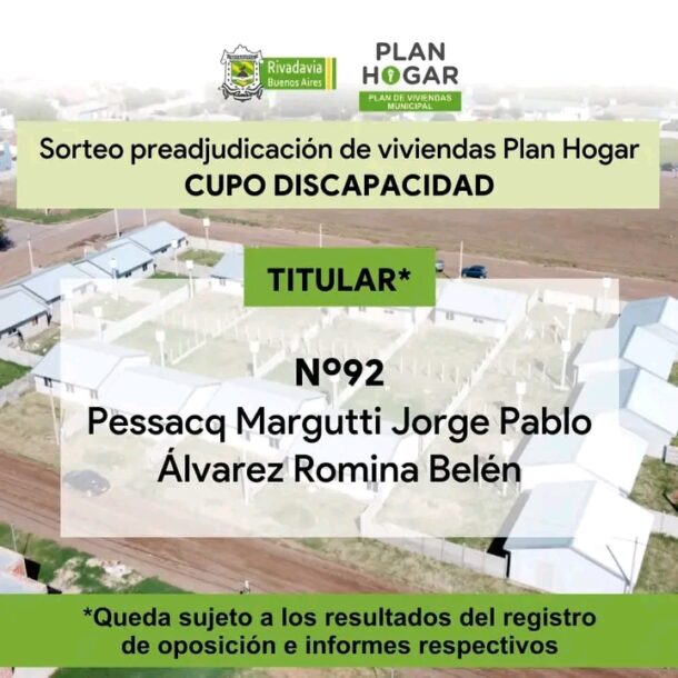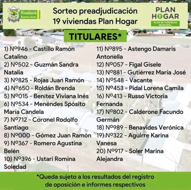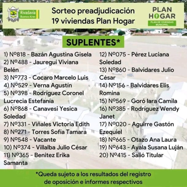 Estos resultados están sujetos a informes de los organismos oficiales pertinentes, lo cual tendría una demora de 30 días. En este sentido, hasta el lunes 24 de abril, el Municipio puso a disposición el listado de preadjudicados con carácter de Registro de Oposición. El objetivo es que aquellos vecinos que deseen oponerse puedan hacerlo, en caso de tener conocimiento de que algún aspirante no reúna los requisitos para ser beneficiario de una vivienda.