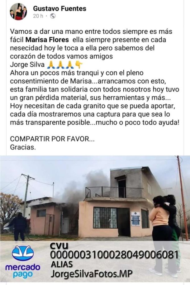 Marisa Flores, dueña de casa, dijo: «Levantarnos y recibir la noticia que nuestra casa se estaba incendiando fue devastador. Las ganas de estar ahí con nuestras hijas y por la distancia no poder hacerlo sumó a la impotencia de no poder hacer nada. Las pérdidas del depósito dónde teníamos heladeras, freezer, mercadería y todo lo que tiene que ver con nuestro emprendimiento ‘La Americana Eventos’se perdió y junto con ello se fueron 10 años de trabajo esforzado. Pero como dijo mi hijo, La Americana Eventos sos vos mamá y te volverás a levantar. Gracias a todos los que ayudaron a nuestros hijos allá, y también a todos los que nos escriben y nos acompañan desde la distancia. Lo dijo el Apóstol Pablo ‘estamos derribados, pero no destruídos y con la ayuda de Dios volveremos a empezar de nuevo’. Mil gracias por acompañarnos, hoy realmente lo necesité».