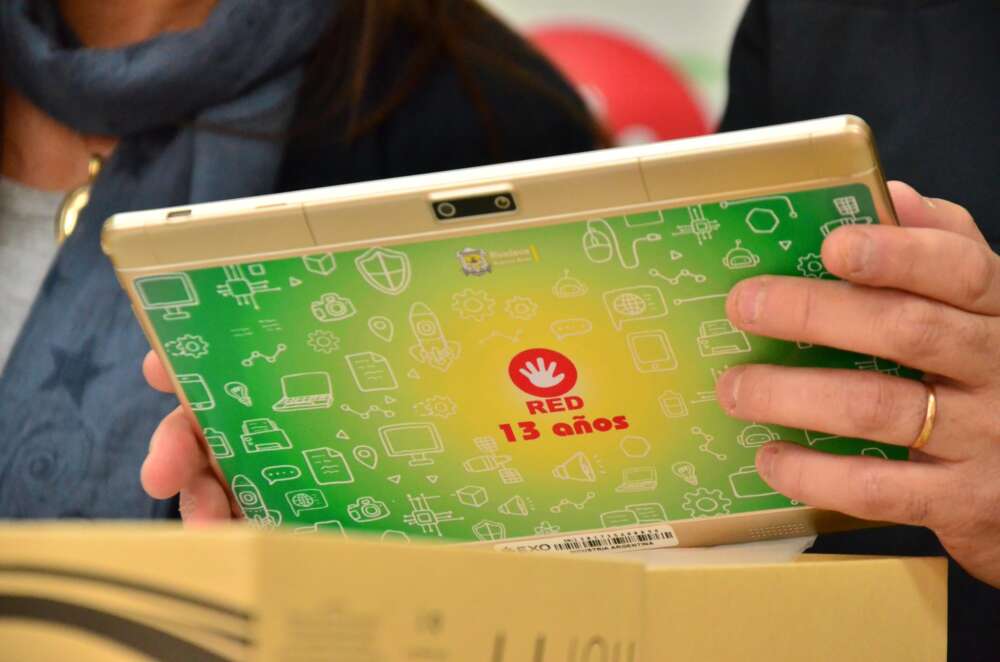 El mandatario Javier Reynoso junto a la directora de Tecnología Celeste Vitale, recibieron los 400 dispositivos que serán entregados a los alumnos que comenzaron la escuela primaria este 2023.