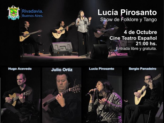 El próximo sábado 4 de octubre la joven nacida en Sansinena y ahora radicada en La Pampa, Lucía Pirosanto actuará con entrada libre y gratuita en el Teatro Español de la ciudad de América. La acompañarán varios músicos de primera línea que harán un show único e incomparable. El evento comenzará a las 21 horas. propaganda