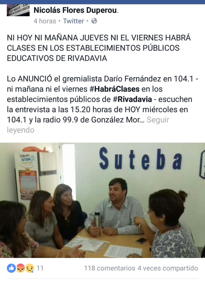 El martes pasado, el gobierno de María Eugenia Vidal convocó a los gremios docentes a una nueva mesa de negociación salarial. El Frente Gremial Docente rechazó la propuesta del gobierno provincial y convocó a sus afiliados a un paro para el 29 y 30 de marzo. A su vez, Suteba – en Rivadavia – ratificó que la medida de fuerza continuará hasta el viernes inclusive. Este anuncio desató un sin fin de comentarios de distintas personas del distrito. A continuación un breve resumen de lo expresado por distintos sectores de la población: