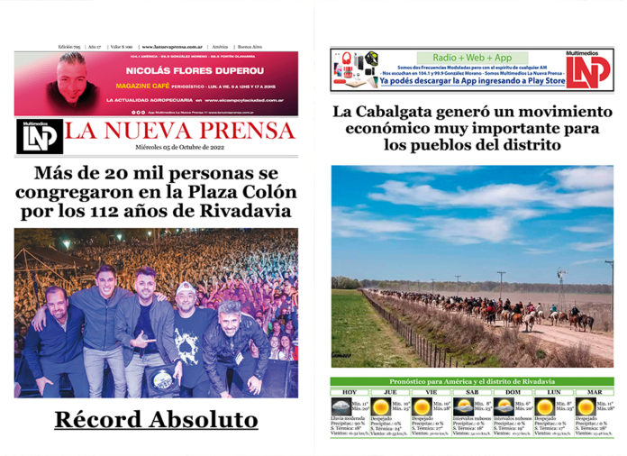 InicioDestacadasTapa y Contratapa del periódico de papel LNP Destacadas Tapa y Contratapa del periódico de papel LNP Por La Nueva Prensa 04/10/2022 0 1324 Compartir FacebookTwitterWhatsAppTelegramEmailImprimir Noticia anteriorLlegan a América las cenizas de la esposa de Mario Lugones, médico e hijo de Ambrosio LugonesNoticia siguienteProducción de cannabis medicinal: cada vez más cerca de ser una realidad en Trenque Lauquen Noticias Relacionados Destacadas Marcelo Marcos y la situación hídrica: «Hoy los volúmenes no son preocupantes» 10/04/2026 Destacadas Duelo tras siniestro vial en Ruta 33 donde perdieron la vida tres empleados del Gobierno de Guaminí 01/04/2026 Destacadas Comenzaron a regir desde el 1 de abril las nuevas tarifas de electricidad en toda la provincia de Buenos Aires 01/04/2026 DEJA UNA RESPUESTA Cancelar respuesta Comentario: Por favor ingrese su comentario Nombre:* Por favor ingrese su nombre aquí Correo electrónico:* ¡Ha ingresado una dirección de correo electrónico incorrecta! Introduzca aquí su dirección de correo electrónico Sitio web: Guarde mi nombre, correo electrónico y sitio web en este navegador para la próxima vez que comente. Current ye@r * Leave this field empty Últimas Noticias Dejar de perder dinero en zonas casi improductivas: «La lógica económica detrás de los corredores biológicos» 14/04/2026 «Cosecha récord y el impacto global en los insumos» 13/04/2026 «Compactación subsuperficial: el desafío de mirar ‘debajo de nuestros pies’ tras 30 años de siembra directa» 13/04/2026 Marcelo Marcos y la situación hídrica: «Hoy los volúmenes no son preocupantes» 10/04/2026 Cargar más