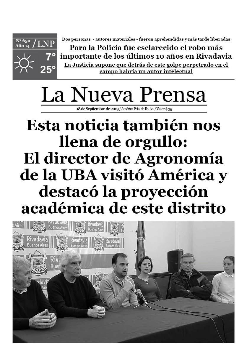 InicioLa Nueva PrensaTapas 18 de septiembre de 2019 La Nueva Prensa Tapas 18 de septiembre de 2019 Por La Nueva Prensa 17/09/2019 0 243 Compartir FacebookTwitterWhatsAppTelegramEmailImprimir Noticia anteriorReynoso participó de un encuentro con el ministro bonaerense Joaquín de la Torre y también cenó con los Transportistas de RivadaviaNoticia siguienteEl funcionario Mariano Zaton informó que aún aguarda resultados de las pruebas enviadas Noticias Relacionados La Nueva Prensa Última Noticia – Ante el avance del Covid el intendente Reynoso limitará los horarios y las actividades en Rivadavia 18/05/2021 La Nueva Prensa Tapas LNP – 23 de diciembre 2020 22/12/2020 La Nueva Prensa Tapas LNP – 18 de noviembre de 2020 17/11/2020 DEJA UNA RESPUESTA Cancelar respuesta Comentario: Por favor ingrese su comentario Nombre:* Por favor ingrese su nombre aquí Correo electrónico:* ¡Ha ingresado una dirección de correo electrónico incorrecta! Introduzca aquí su dirección de correo electrónico Sitio web: Guarde mi nombre, correo electrónico y sitio web en este navegador para la próxima vez que comente. Current ye@r * Leave this field empty Últimas Noticias Retos virales en las escuelas: «En la región tenemos unas 15 denuncias, esto no es joda» 29/04/2026 El caudal del Río Quinto en Rivadavia se cuadruplicó en los últimos 20 días 23/04/2026 El diario La Nación reflejó el trabajo que hace 20 años ejerce un nativo de Colonia Seré 20/04/2026 En América hubo una importante movilización docente reclamando la defensa del IPS 20/04/2026 Cargar más