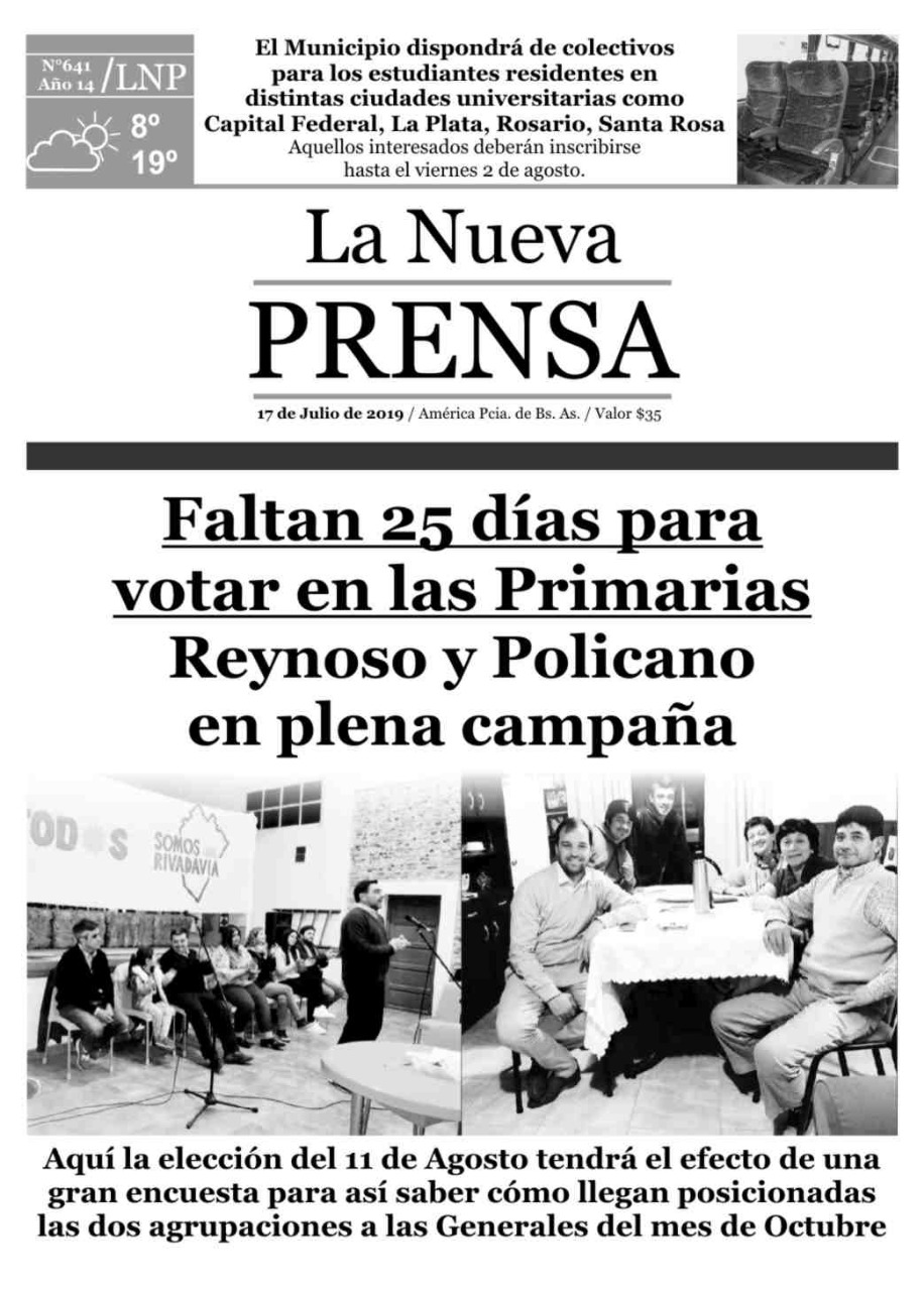 InicioLa Nueva PrensaTapas LNP - 17 de julio de 2019 La Nueva Prensa Tapas LNP – 17 de julio de 2019 Por La Nueva Prensa 16/07/2019 0 304 Compartir FacebookTwitterWhatsAppTelegramEmailImprimir Noticia anteriornecrologica 15/07/2019Noticia siguienteSe instaló otro nodo solar para cargar dispositivos móviles: Está en la parquización de las vías Noticias Relacionados La Nueva Prensa Última Noticia – Ante el avance del Covid el intendente Reynoso limitará los horarios y las actividades en Rivadavia 18/05/2021 La Nueva Prensa Tapas LNP – 23 de diciembre 2020 22/12/2020 La Nueva Prensa Tapas LNP – 18 de noviembre de 2020 17/11/2020 DEJA UNA RESPUESTA Cancelar respuesta Comentario: Por favor ingrese su comentario Nombre:* Por favor ingrese su nombre aquí Correo electrónico:* ¡Ha ingresado una dirección de correo electrónico incorrecta! Introduzca aquí su dirección de correo electrónico Sitio web: Guarde mi nombre, correo electrónico y sitio web en este navegador para la próxima vez que comente. Current ye@r * Leave this field empty Últimas Noticias El caudal del Río Quinto en Rivadavia se cuadruplicó en los últimos 20 días 23/04/2026 El diario La Nación reflejó el trabajo que hace 20 años ejerce un nativo de Colonia Seré 20/04/2026 En América hubo una importante movilización docente reclamando la defensa del IPS 20/04/2026 Dejar de perder dinero en zonas casi improductivas: «La lógica económica detrás de los corredores biológicos» 14/04/2026 Cargar más